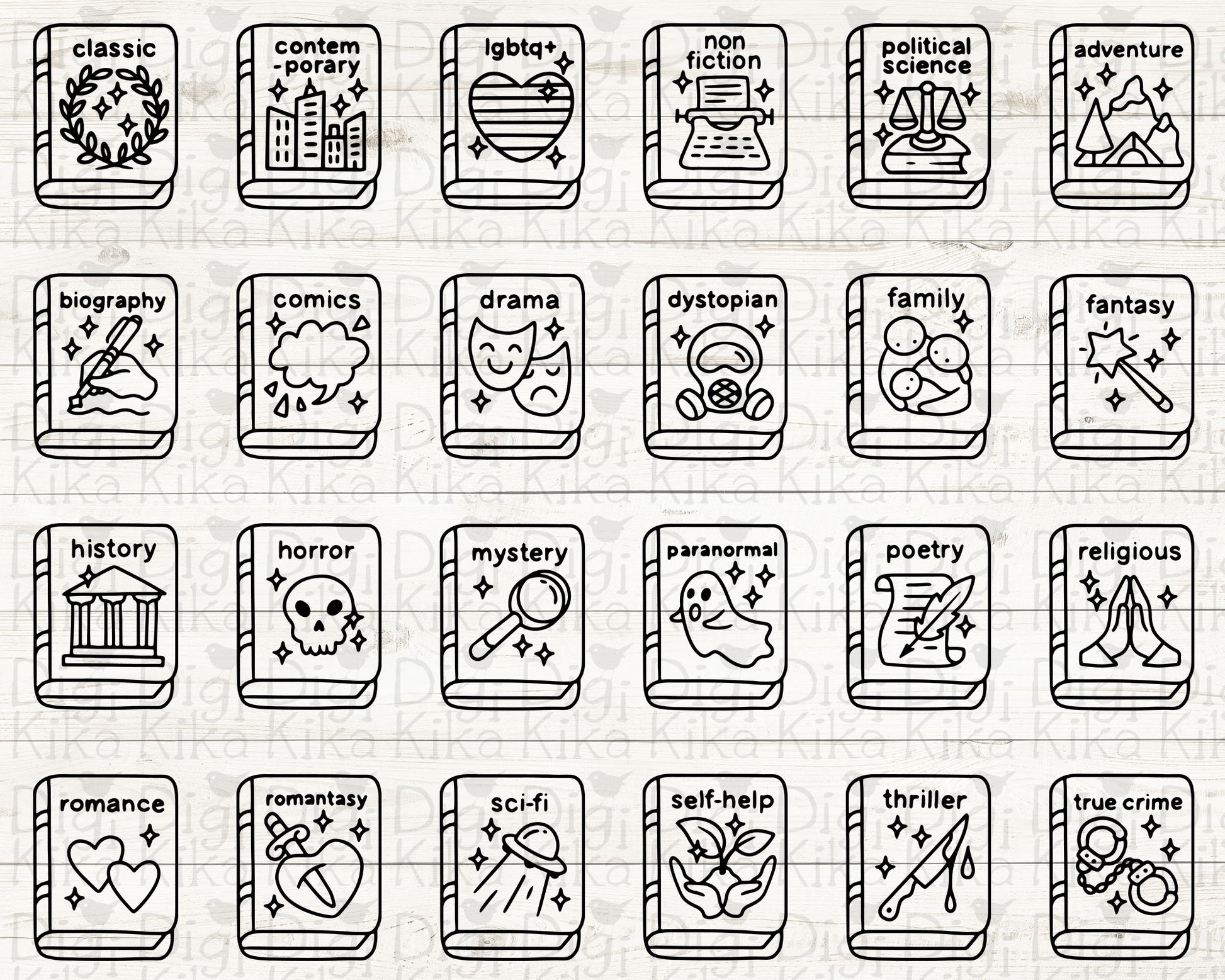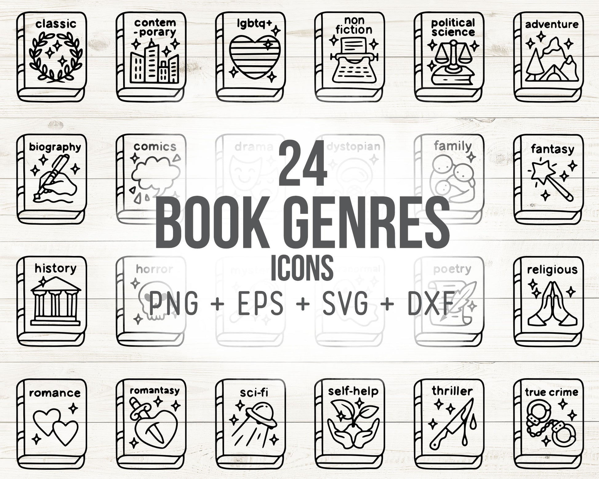 24 Book Genre Icons DOODLE ClipArt | Digital Reading Planner Graphics | EPS, SVG, DXF, PNG Instant Download