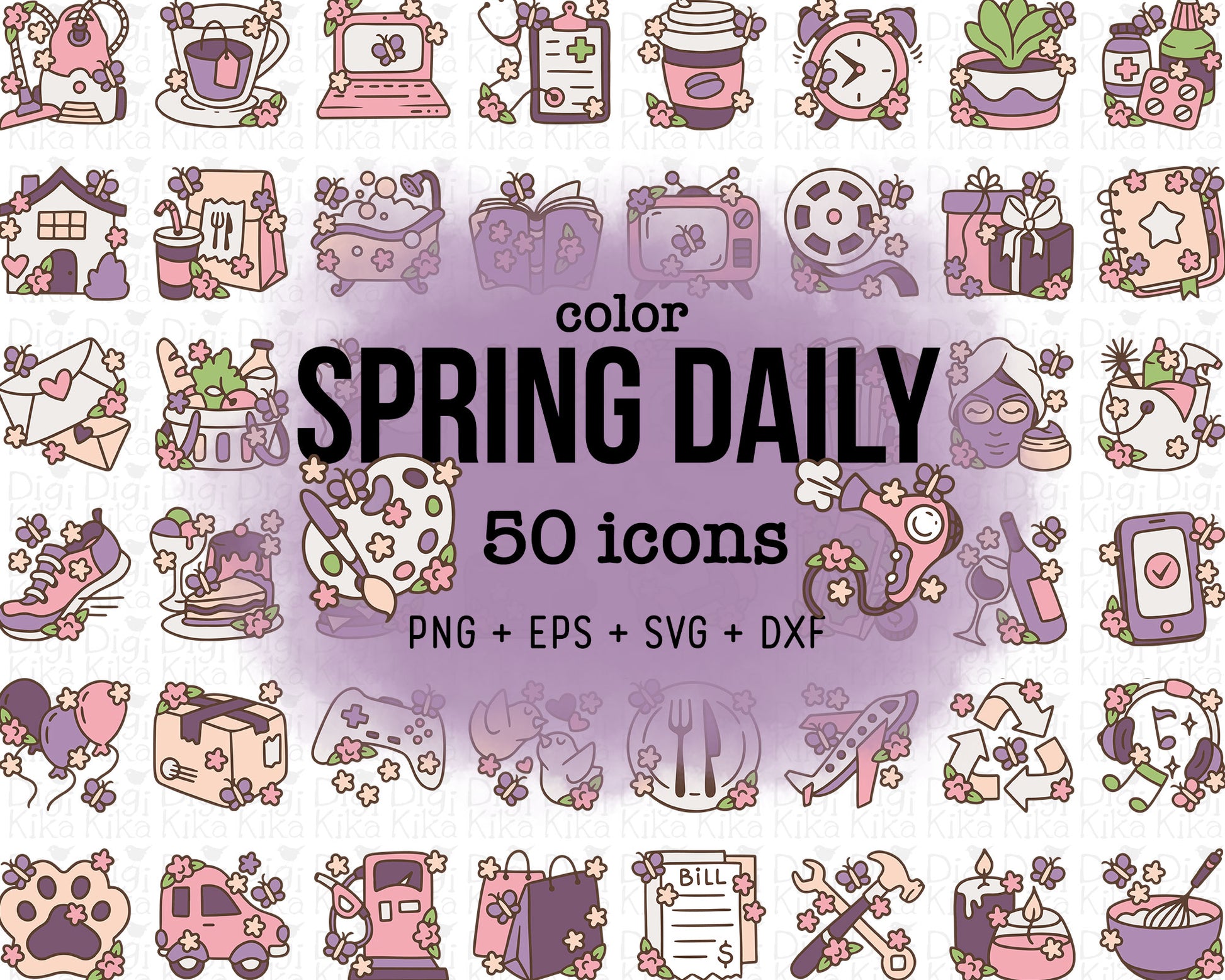 50 Spring Daily Icons COLOR - EPS, SVG, DXF, PNG Clipart - Instant Download
