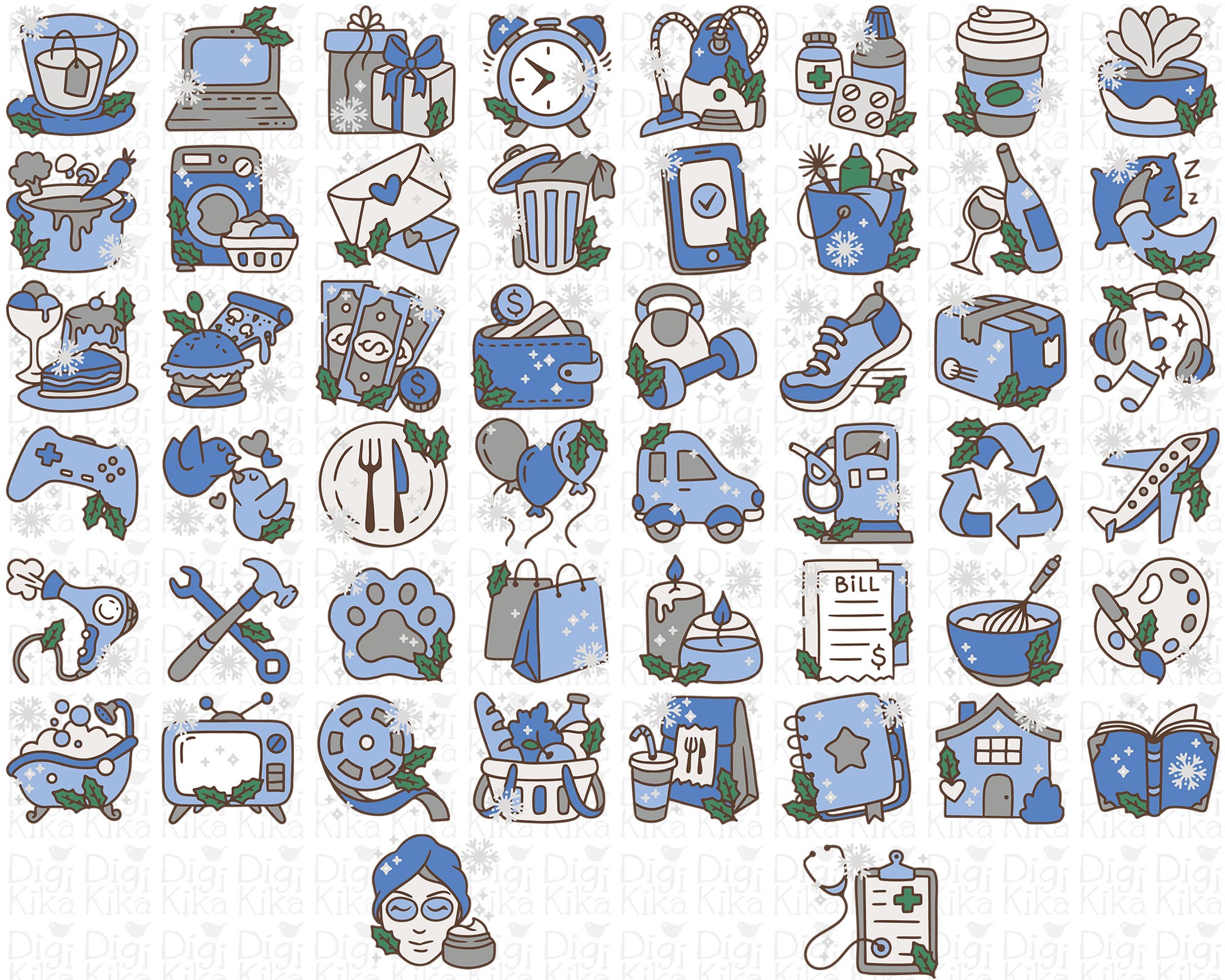 Embrace the cozy season with this 50 Winter Daily Icons COLOR Clipart Set, featuring vibrant daily activity illustrations beautifully decorated with delicate snowflakes and winter foliage in cool seasonal colors. These charming icons transform everyday routines like reading, exercising, or working into frost-kissed delights, perfect for winter planners, holiday-themed schedules, seasonal projects, and cold-weather craft projects.