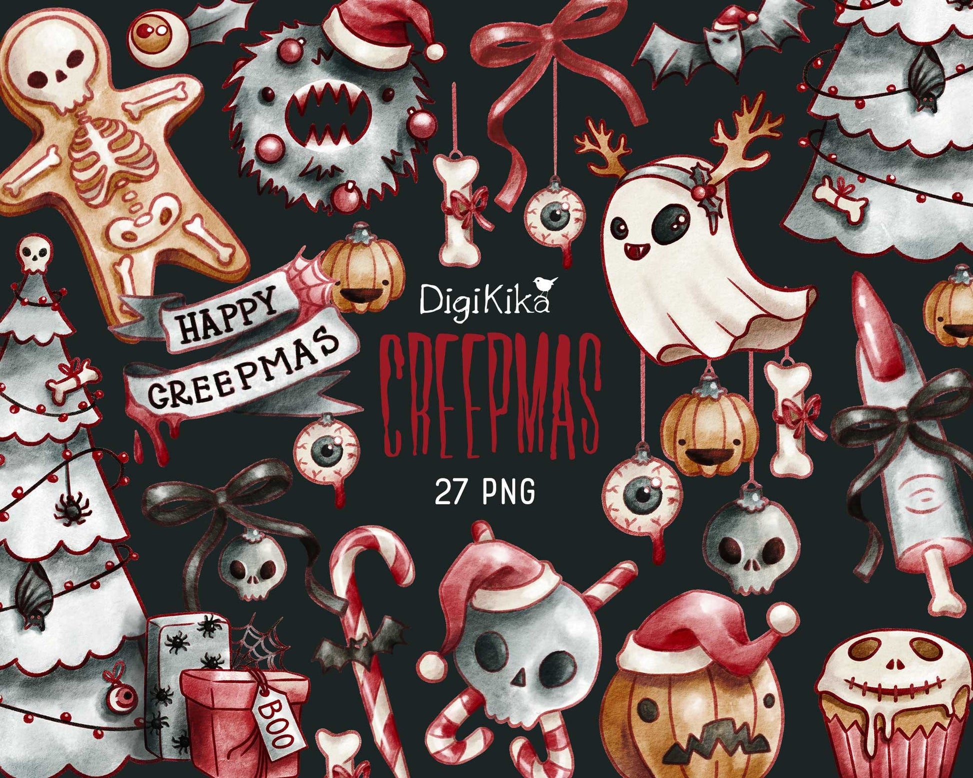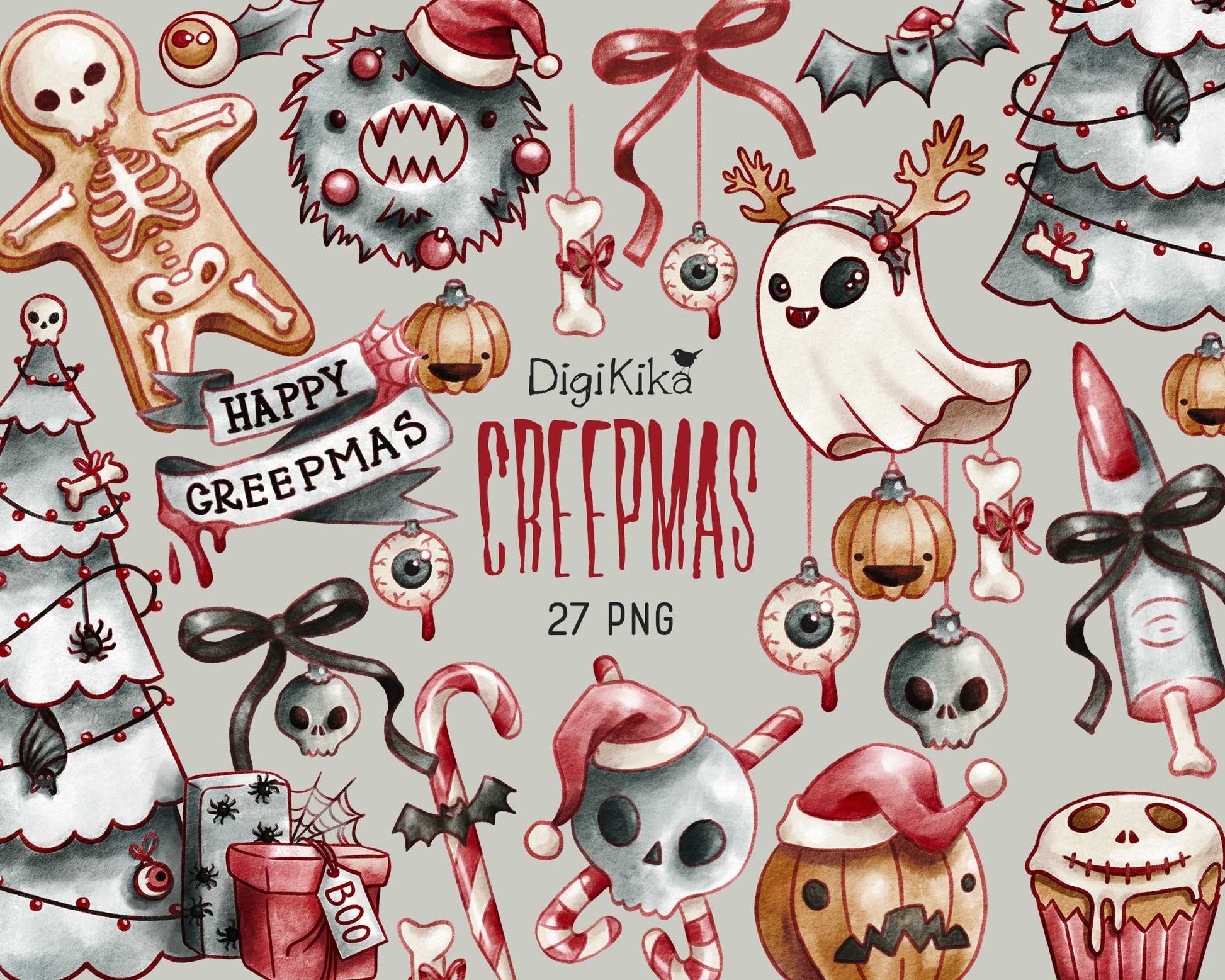 Creepmas Watercolor Clipart, Hand Painted Christmas Clip Art, Stickers Clipart, Sticker Graphics, Hand Draw, Planner Supplies, Crafts