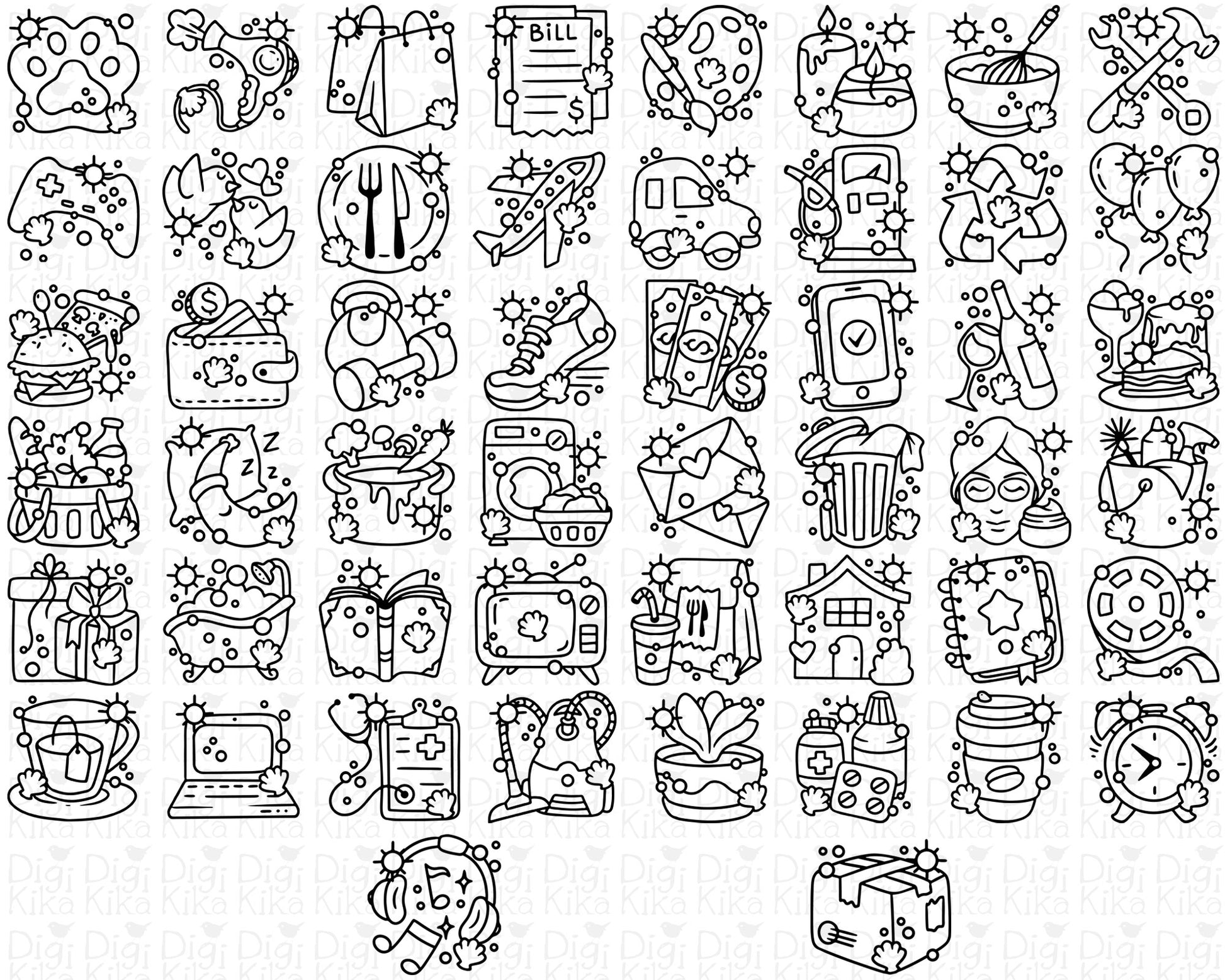 Get complete creative flexibility with this Daily Icons DOODLE Mega Bundle, featuring all six hand-drawn seasonal and themed sets with 300 total illustrations. This comprehensive collection includes everyday activities decorated with spring flowers, summer suns, fall pumpkins, winter snowflakes, neutral shine effects, and classic designs — perfect for year-round planning, planner stickers, digital projects, and seasonal crafting with cohesive doodle-style graphics.