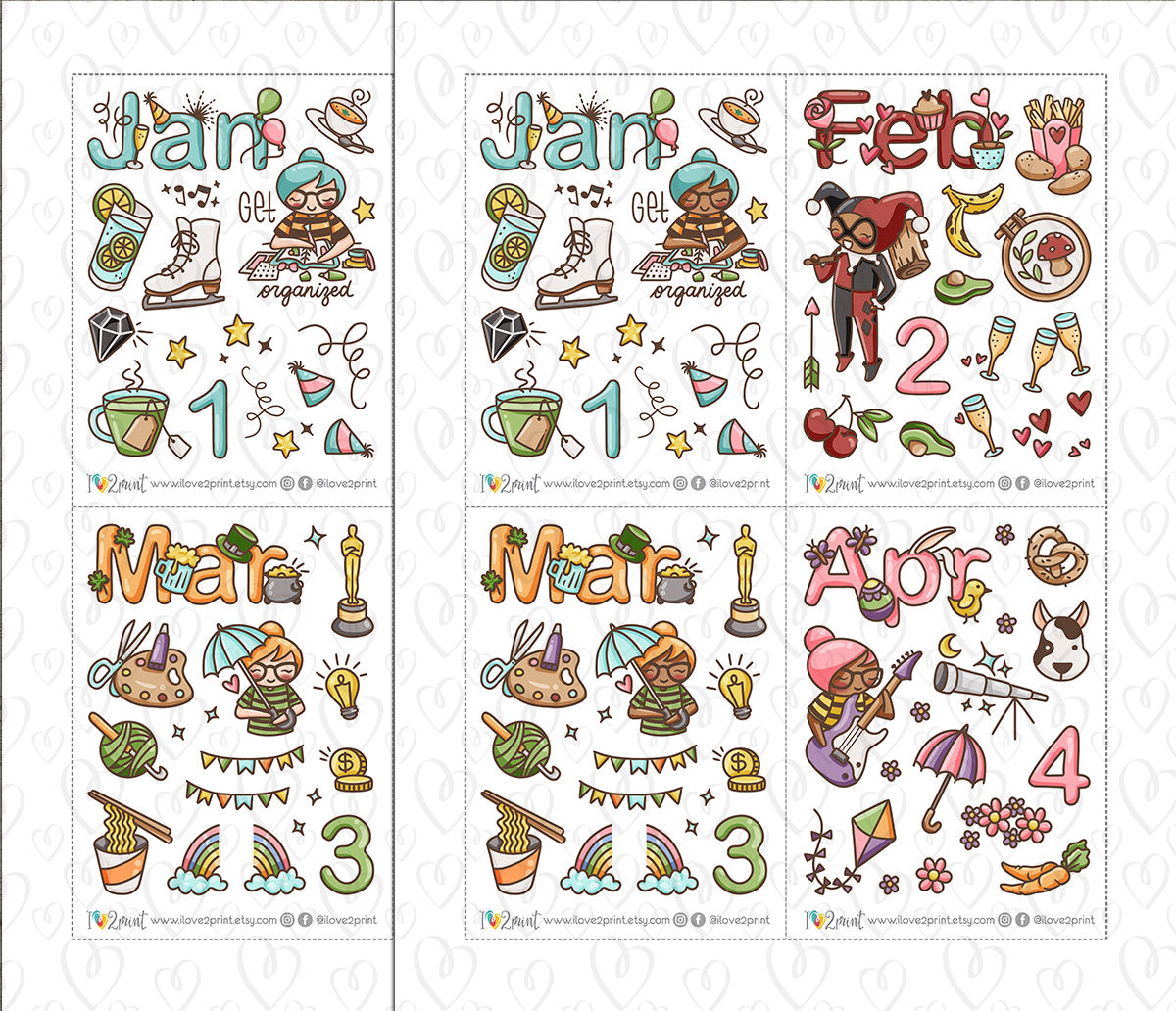 Elena Decorative Monthly Stickers - COLOR (2 skin variations) Printable Planner Sticker - PDF & Cut Files