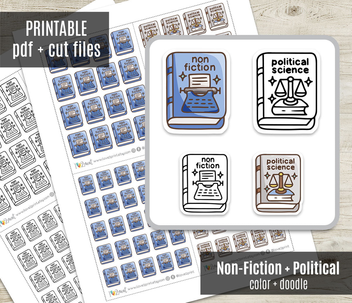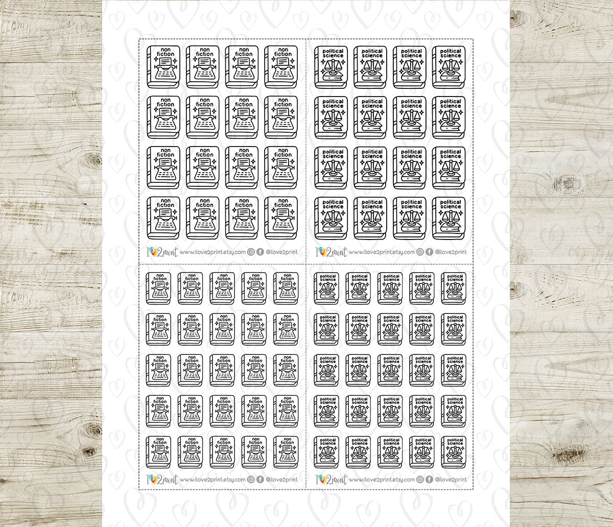 Non Fiction & Political Science Book Genre Icons – Printable Planner Stickers – PDF & Cut Files