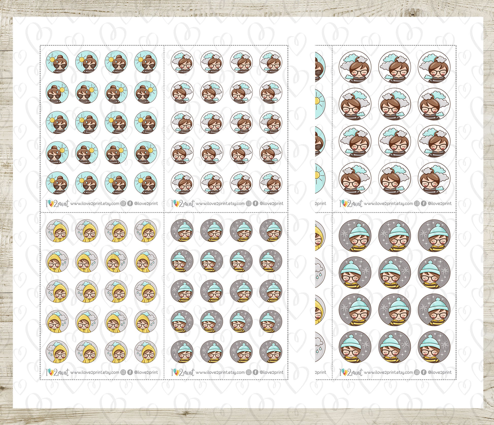 Track forecasts with a smile! These Elena Weather Circles (LIGHT skin BROWN hair) feature our planner girl doodled with sun hats, rain coat, cloud and rainbows in 2 sizes – all wrapped in playful circular borders. Perfect for weekly planners, mood tracking, or garden journals.