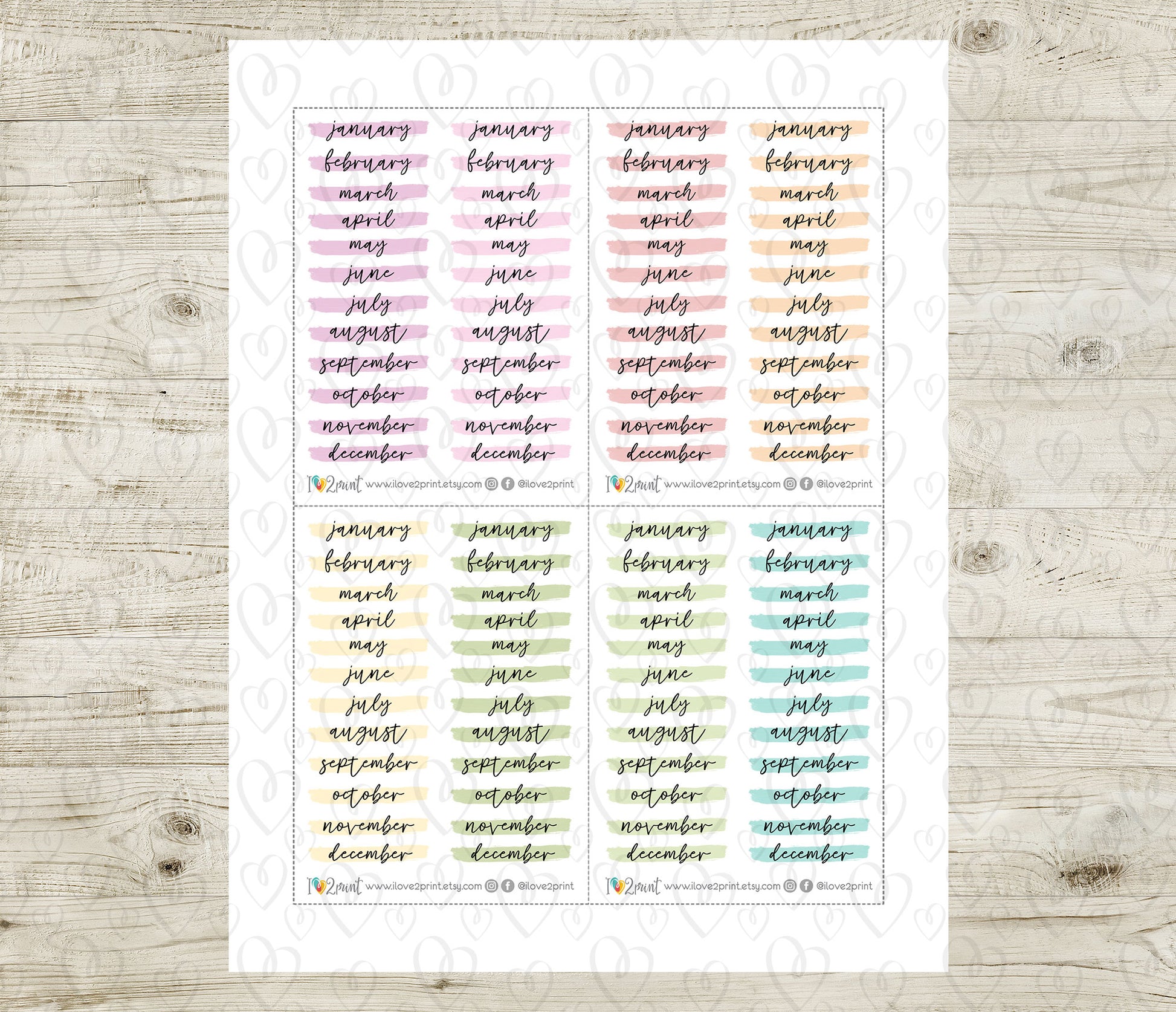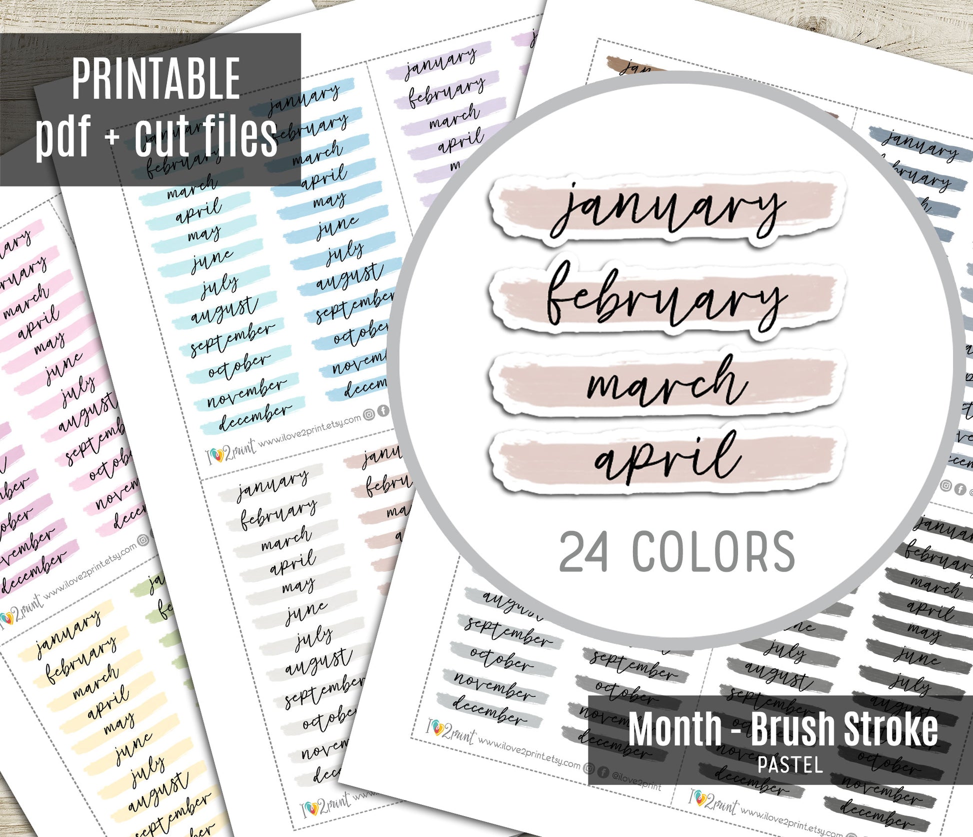 Month Headers Brush Stroke Pastel Color Stickers - Printable Month Banner - PDF & Cut Files