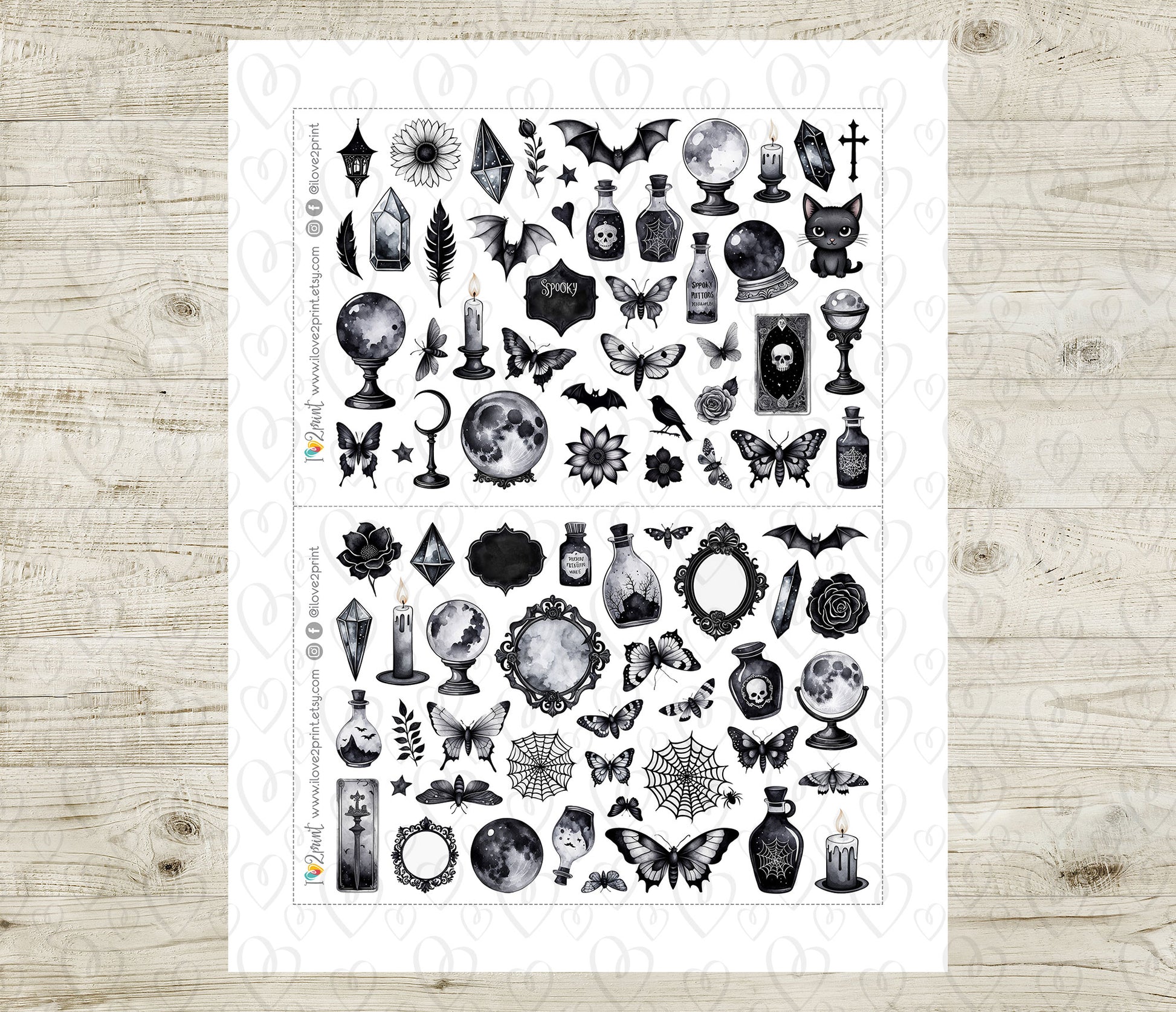 Bring a touch of dark elegance to your planner with the Spooky Time Printable Stickers 🦇🌙. This AI crafted black and white set features bats, moons, mirrors, butterflies, and other gothic-inspired elements—perfect for adding a spooky-chic vibe to planners, journals, scrapbooks, or Halloween crafts. Includes PDF and cut files for Cricut and Silhouette, so you can easily print and cut at home.