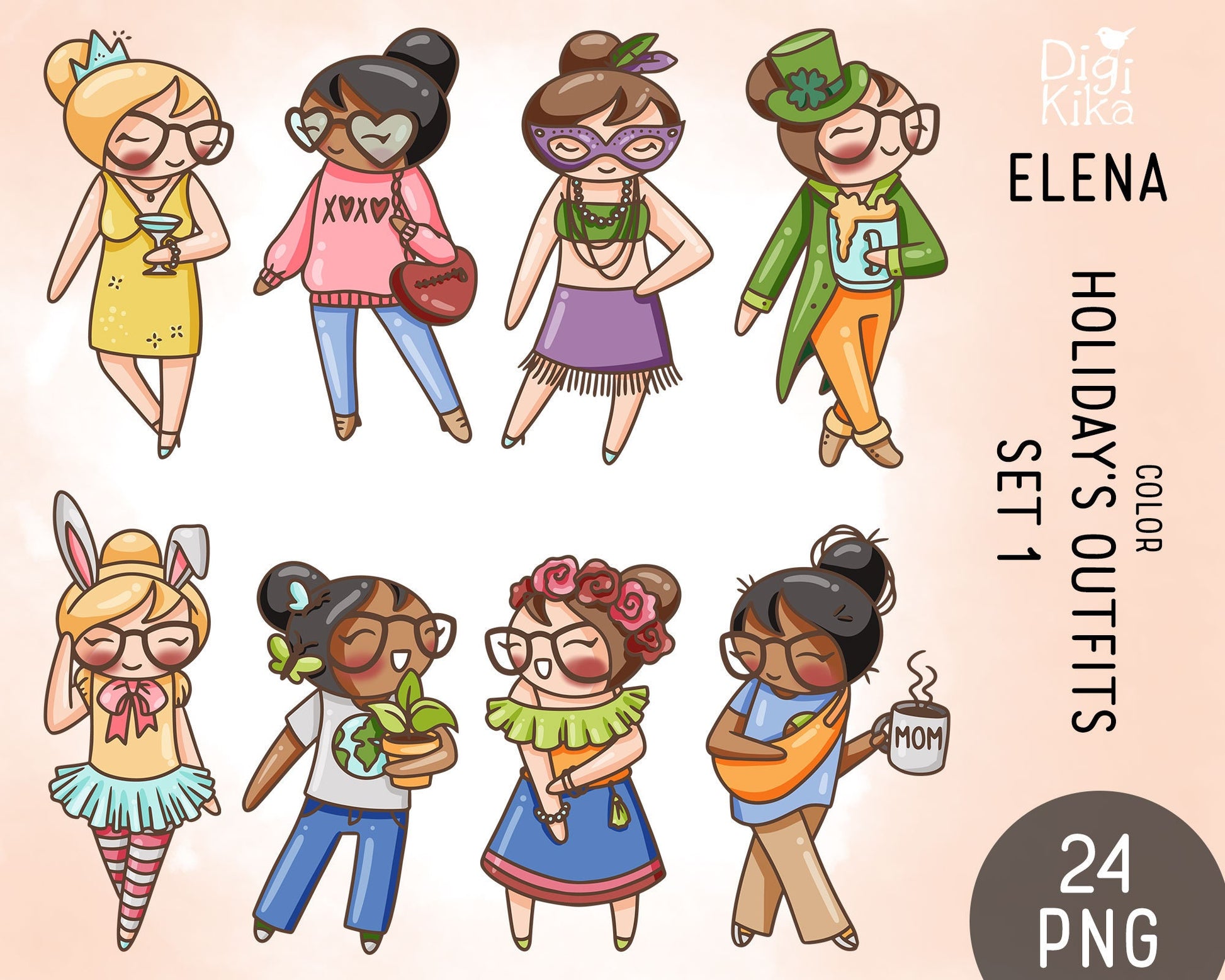 This hand drawn Elena the planner girl - COLOR Set 2 (Light and Brown Skin) Holiday's Outfits / Fashion Clothes (new year, valentines, mardi gras, st patrick, easter, earth day, cinco de mayo, mother's day) it's perfect you want to create anything for scrapbook, card design, invitation making, planner stickers, jewelry, paper crafts, web design, party supplies, invitations, party tags, invites, cupcake toppers, and a lot more.